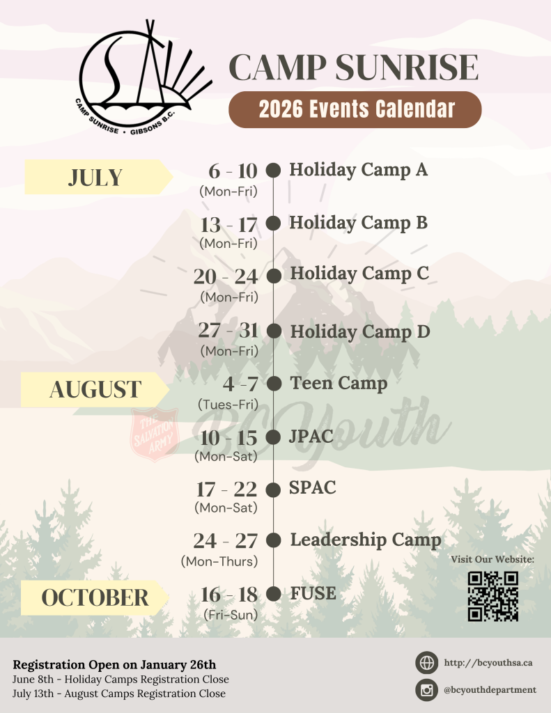 Camp Sunrise, a ministry of the Salvation Army, was founded in 1925. Located in Gibsons, BC, next to the Langdale ferry terminal, Camp Sunrise is just a short 35-minute ferry ride away from Horseshoe Bay.